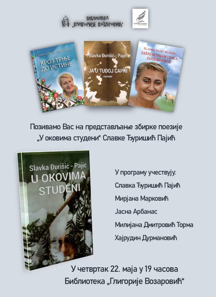 U četvrtak, 22. maja u 19 sati u Biblioteci „Gligorije Vozarović“ biće predstavljena zbirka poezije „U okovima studeni“ Slavke Đurišić Pajić. Osim autorke o knjizi će govoriti recenzent Mirjana Marković, predsednik Književne zajednice Sremska Mitrovica. Poeziju će čitati književnica Jasna Arbanas, dok će za muzički deo programa biti zadužen kantautor Hajrudin Durmanović. Program će moderirati Milijana Dmitrović Torma, viši diplomirani bibliotekar.