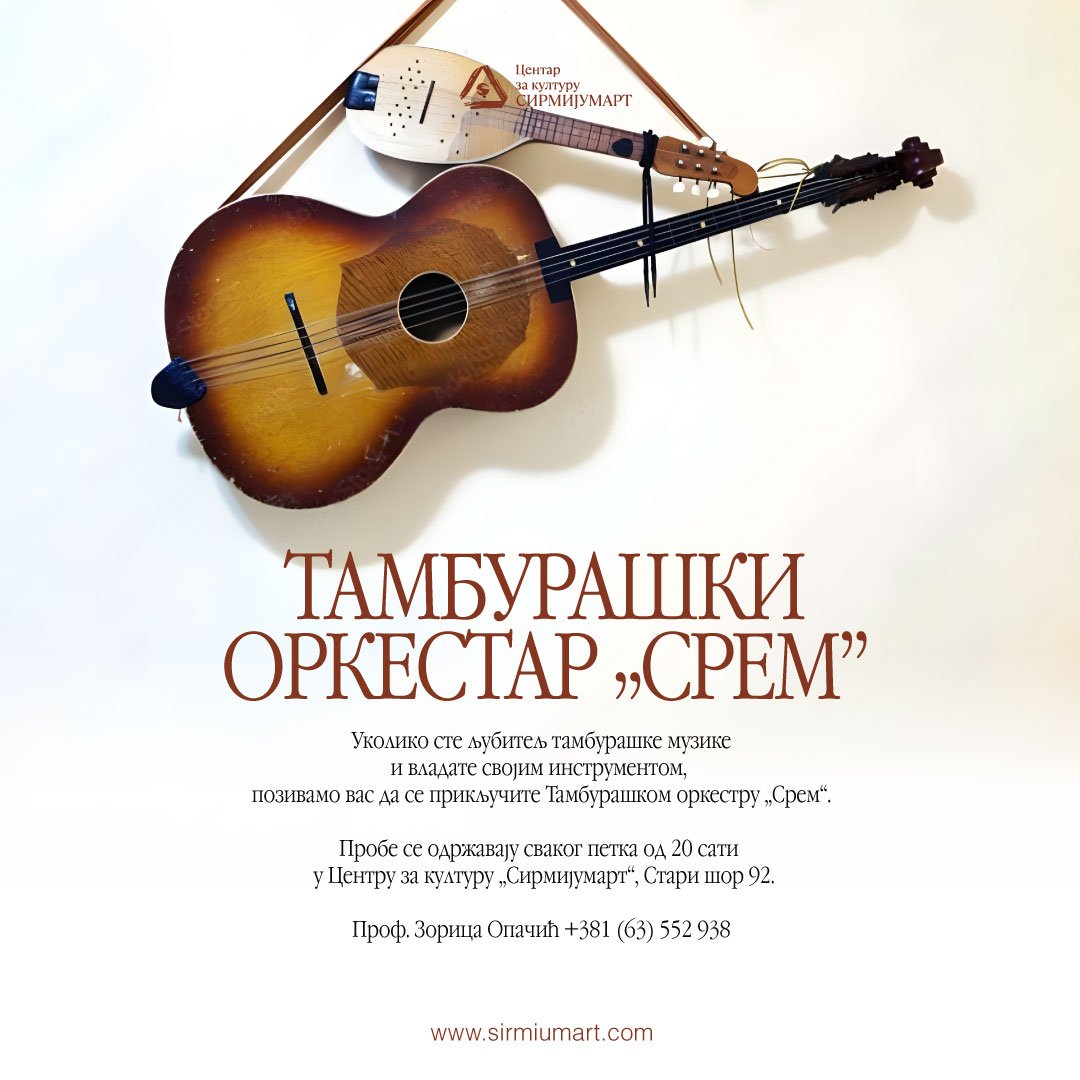– Ukoliko u srcu nosite ljubav prema tamburaškoj muzici i sa ponosom svirate svoj instrument, pozivamo vas da postanete deo naše muzičke porodice. Pridružite se Orkestru koji već decenijama čuva i prenosi bogatstvo sremske tradicije, gradeći prijateljstva i zajedništvo kroz zvuke tambure – muzike koja spaja generacije. Kroz svoju istoriju, naš orkestar je iznedrio brojne vrsne muzičare i ostavio dubok trag u očuvanju i promovisanju tamburaške umetnosti. Upravo zato „Srem“ nije samo orkestar – on je čuvar jednog dela našeg nematerijalnog kulturnog nasleđa. Budite deo tamburaške priče koja živi u svakoj žici, u svakoj pesmi i u srcima svih generacija, navode iz orkestra.