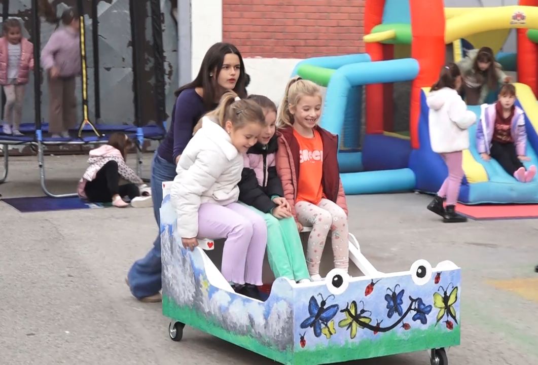 Stariji učenici vozaju mlađe igračkom automobilom u Novoj Pazovi