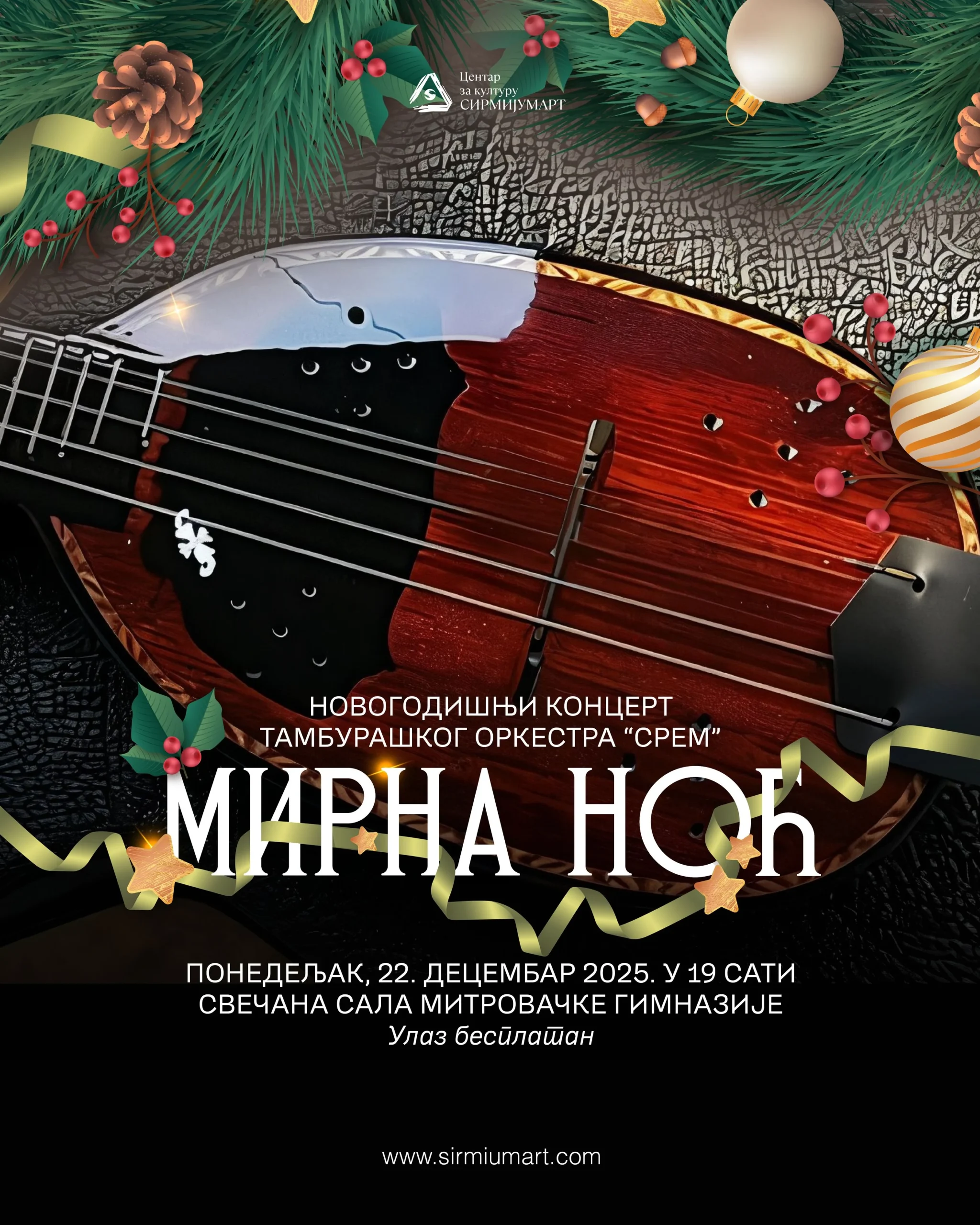 Centar za kulturu „Sirmijumart“ sa zadovoljstvom vas poziva na svečani Novogodišnji koncert Tamburaškog orkestra „Srem“, pod rukovodstvom prof. Zorice Opačić, koji će se održati u ponedeljak, 22. decembra. Kao poklon sugrađanima i svim ljubiteljima zvuka tambure, koncert pod imenom „Mirna noć“ biće upriličen u Svečanoj sali Mitrovačke gimnazije, sa početkom u 19 časova.
