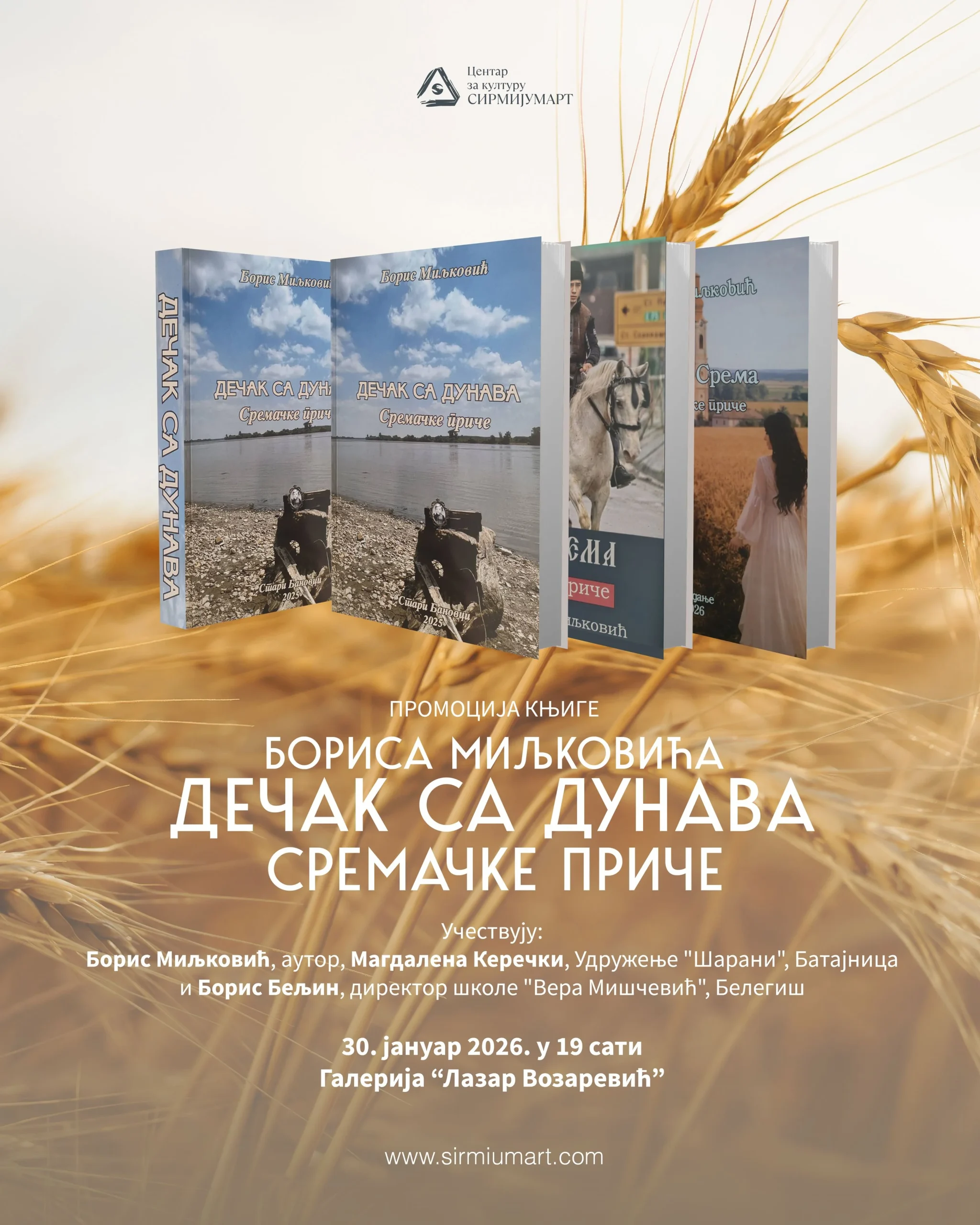 Centar za kulturu „Sirmijumart“ organizuje promociju knjige „Dečak sa Dunava – Sremačke priče“, autora Borisa Miljkovića, u petak, 30. januara, sa početkom u 19 časova, u sali Galerije „Lazar Vozarević“.