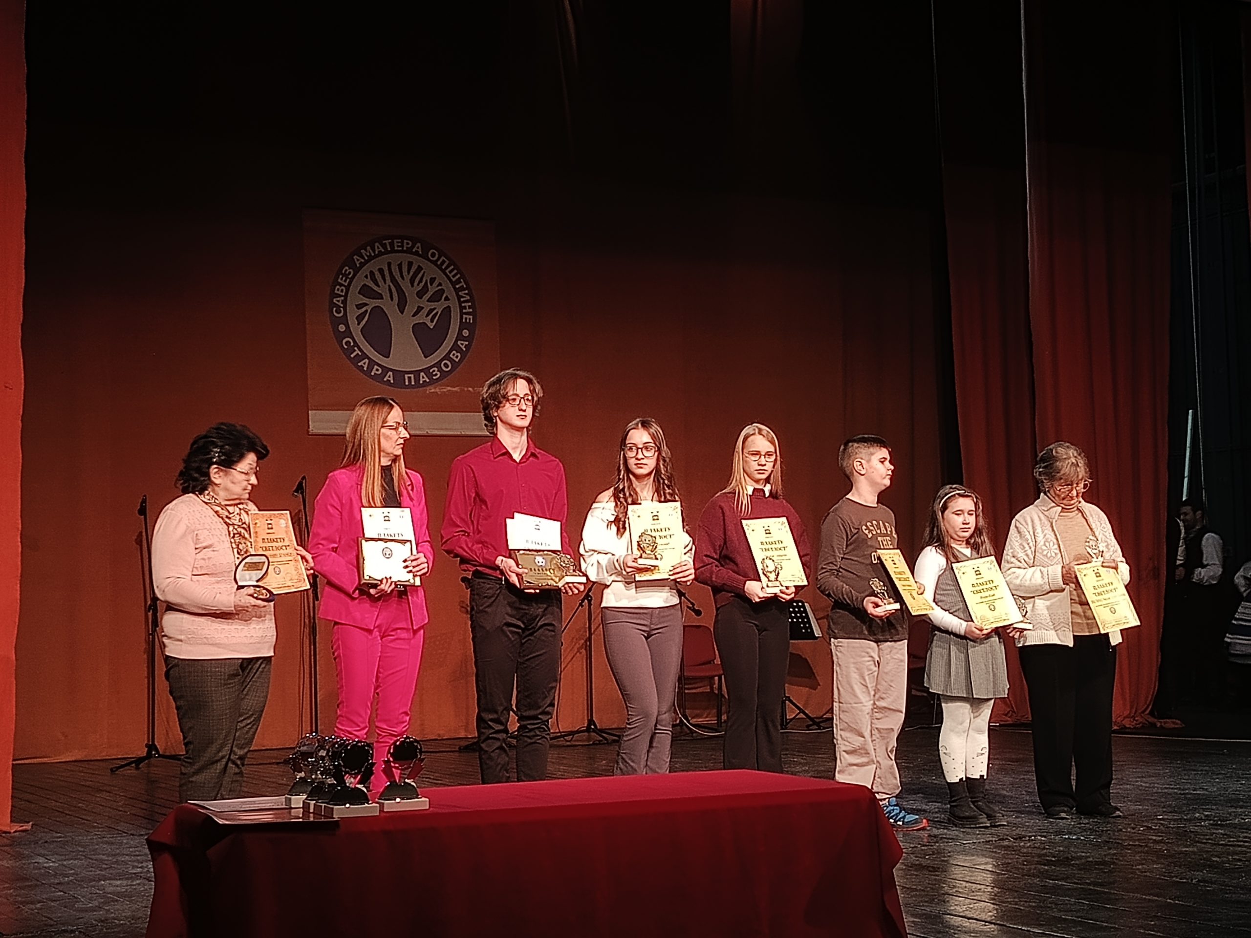 Plakete i diplome uručile su Ljibuška Lakatoš, direktorka Centra za kulturu, Ivana Nenadić, načelnica Odeljenja za društvene delatnosti i Nataša Eror, predsednica Skupštine opštine Stara Pazova.
