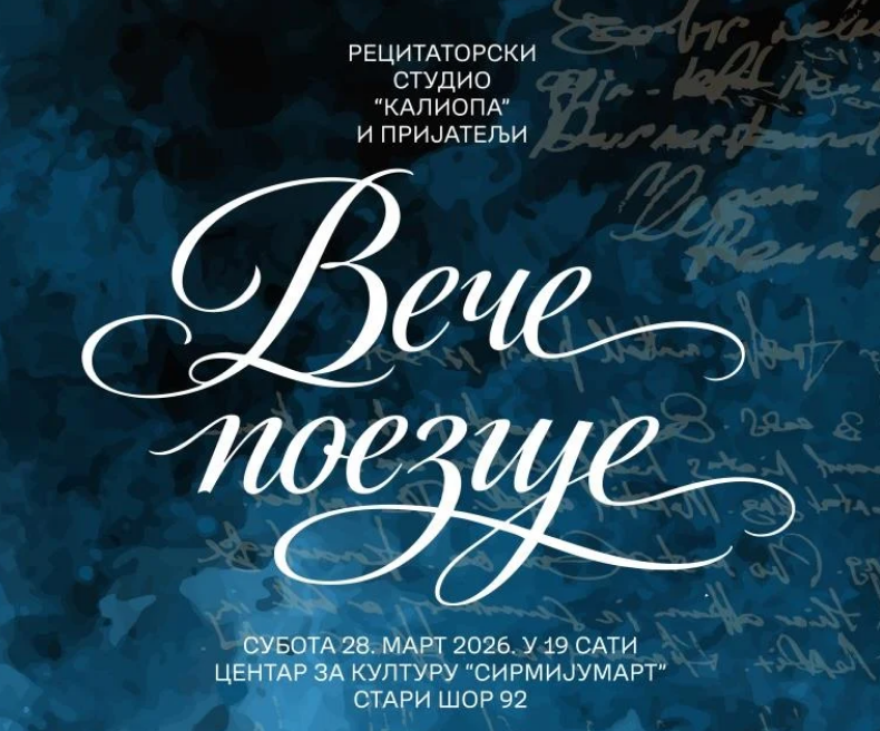 Recitatorski studio „Kaliopa“ i prijatelji prirediće nezaboravno veče poezije za sve ljubitelje lepote izgovorene i napisane reči. Publiku očekuje program u kojem će nastupiti recitatori različitih generacija. Takođe, susretu će posebnu vrednost dati učešće petoro učenika osnovnih škola, koji su se plasirali na zonsko takmičenje u recitovanju.