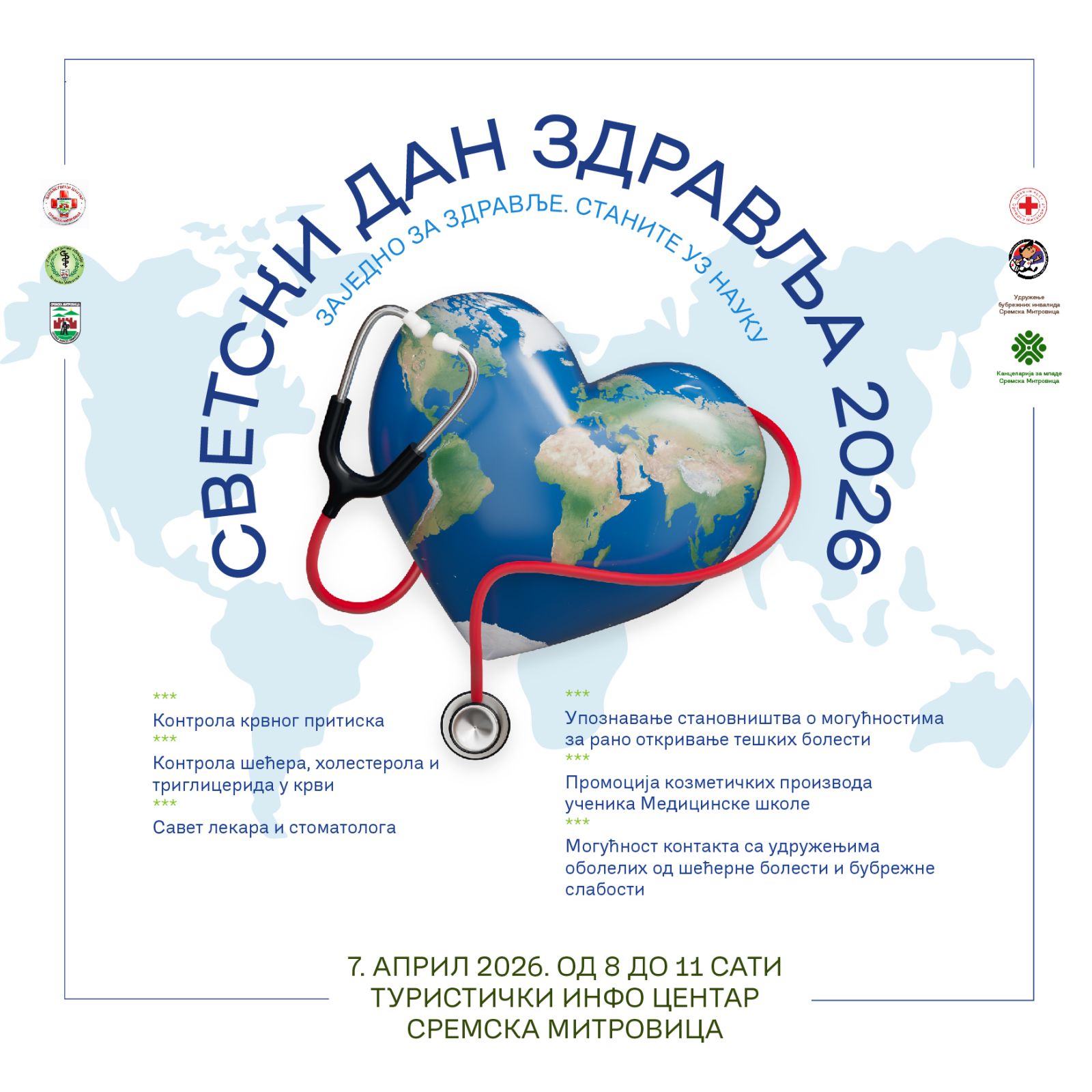 Sremska Mitrovica će Svetski dan zdravlja obeležiti 7.aprila, od 8 do 11 časova, u prostorijama Turističkog info centra u Gradskom parku, različitim besplatnim zdravstvenim pregledima i lekarskim savetima, a za organizaciju su zaduženi mitrovački Zdravstveni centar i Zavod za javno zdravlje, u saradnji sa Crvenim krstom, Medicinskom školom, Udruženjem bubrežnih invalida i Kancelarijom za mlade.
